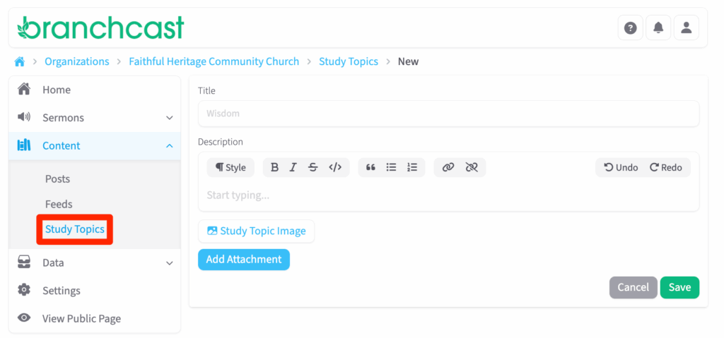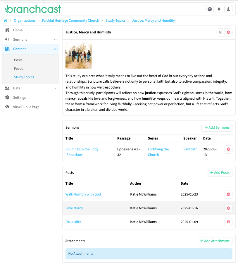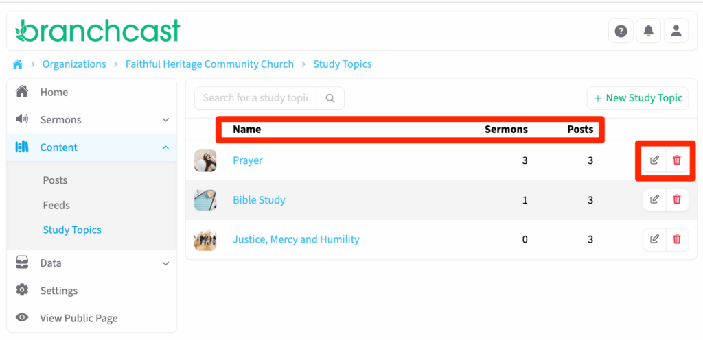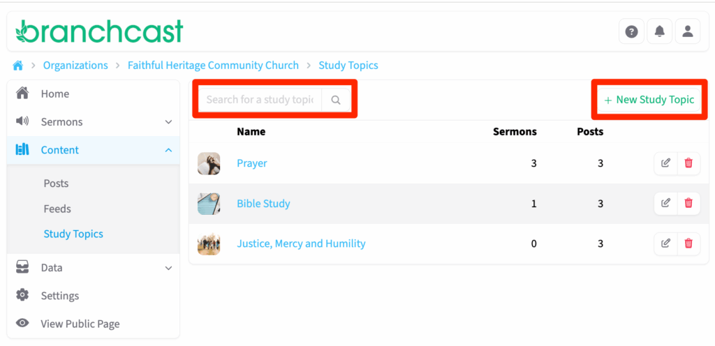 The Study Topics page allows you to organize and group sermons and posts by common themes or biblical topics. This helps listeners and readers easily find related content within your Branchcast site. From this page, you can view, search, add, edit, or delete study topics.