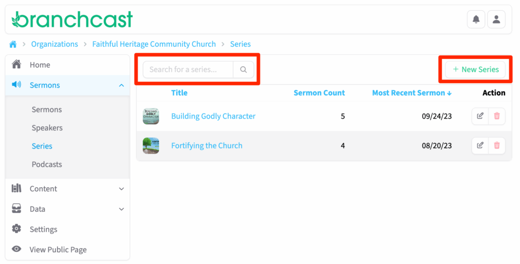The Series page allows you to view, search, and manage all sermon series within Branchcast. From here, you can add new series, edit existing ones, delete series, and view all sermons included in a particular series.